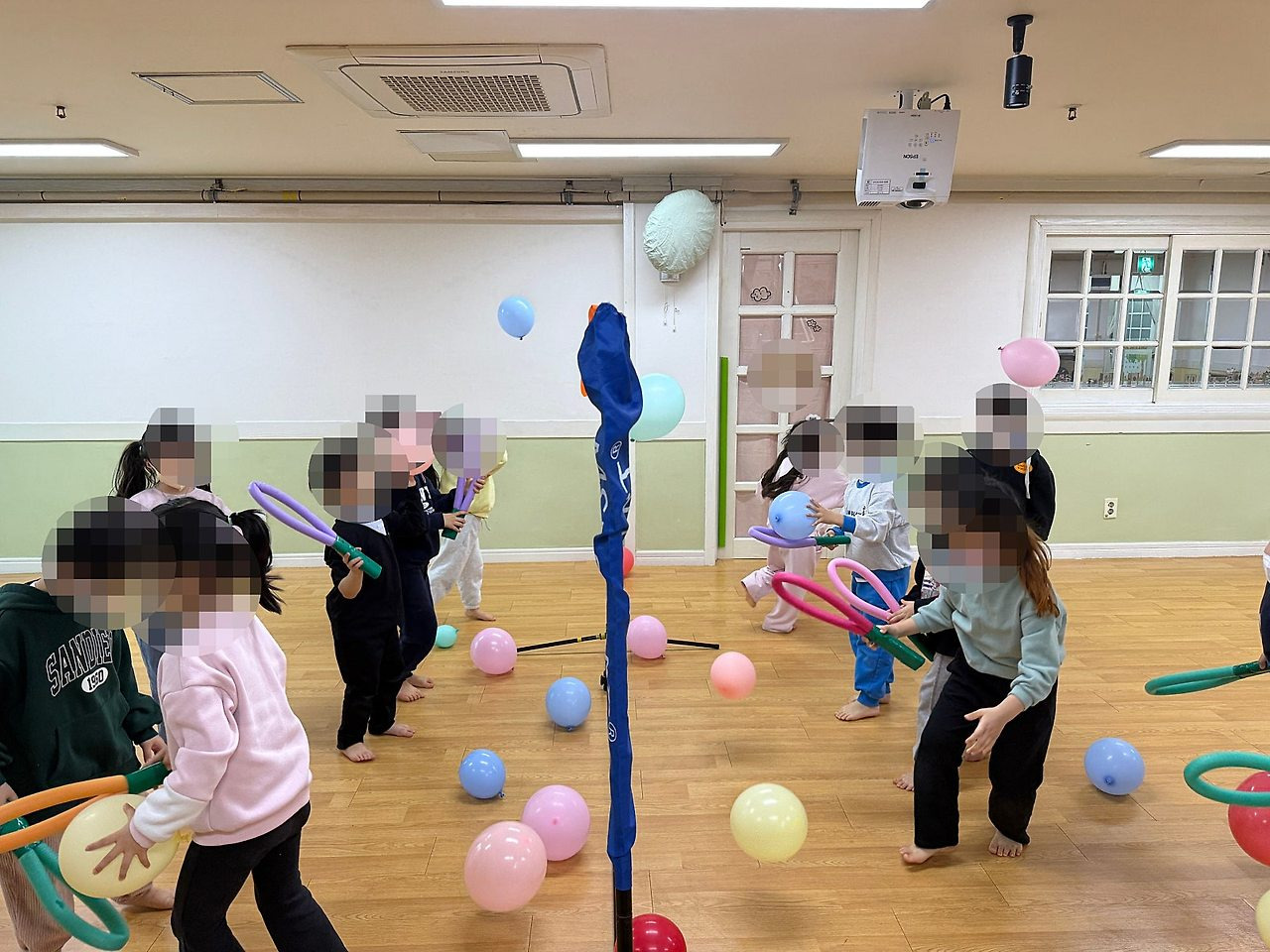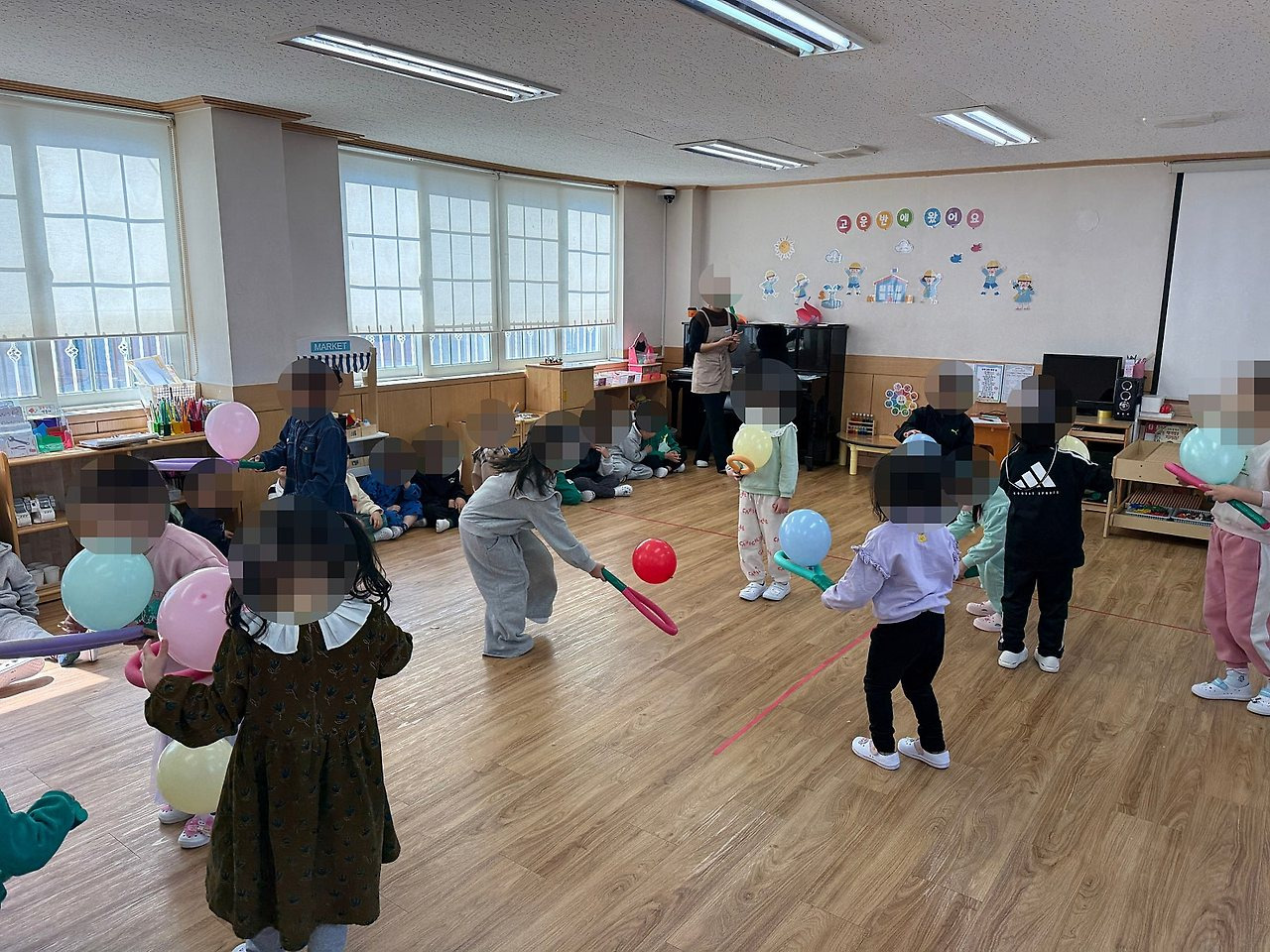 6. 부산유아체육 유아체육활동: 라켓으로 떨어지는 풍선을 치는 모습입니다!!