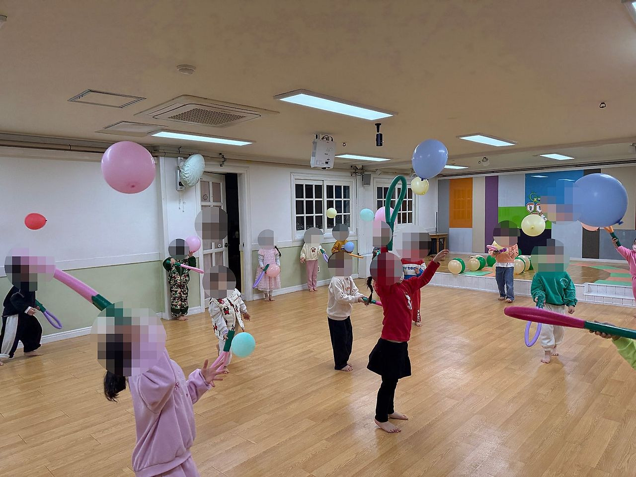 2. 부산유아체육 유아체육활동: 풍선 꼬리를 잡아 흔드는 모습입니다!!