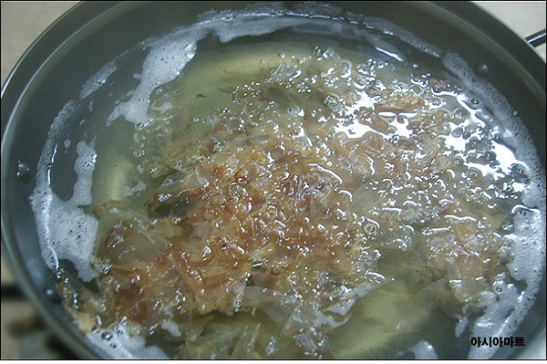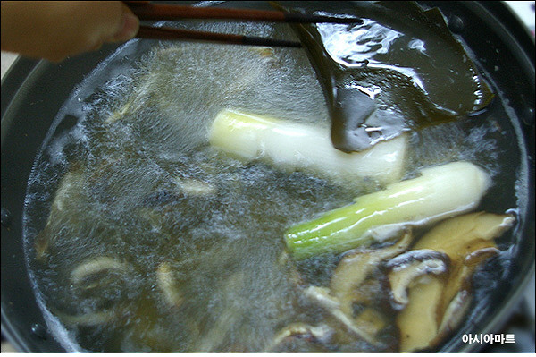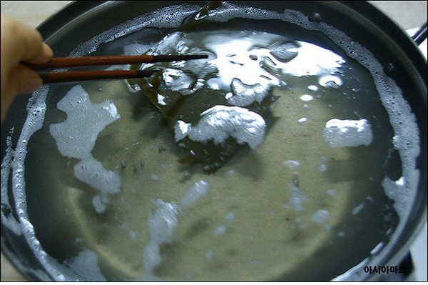 찬물1.5L에 다시마를 넣고 불린 후 불에 올려 물이 끓으면 다시마를 건져내고