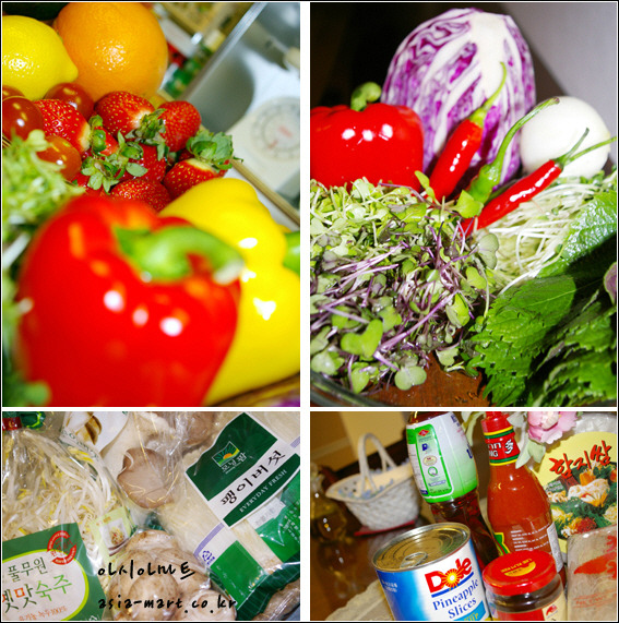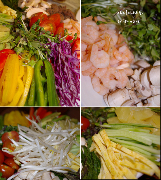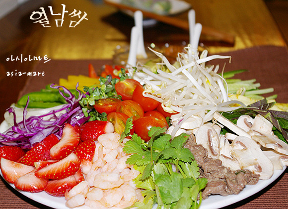 재료 : 라이스페이퍼30장, 소고기불고기감800g, 크래미4개, 딸기150g, 파인애플슬라이스4개, 키위2개, 토마토150g, 아보카도1개, 파프리카1개, 당근1/2개, 양파1, 숙주200g, 대파1대, 고수50g, 애플민트20g, 깻잎20장, 미나리50g, 청경채80g, 쑥갓50g, 팽이버섯150g, 새 송이버섯150g, 표고버섯150g, 느타리버섯150g,