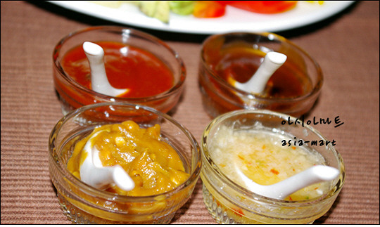 1) 겨자소스 : 시판 허니 머스타드 소스 또는 연 겨자 2작은 술, 꿀(요리당)2작은 술, 마요네즈4큰 술, 식초 2작은 술, 소금, 후추 약간
