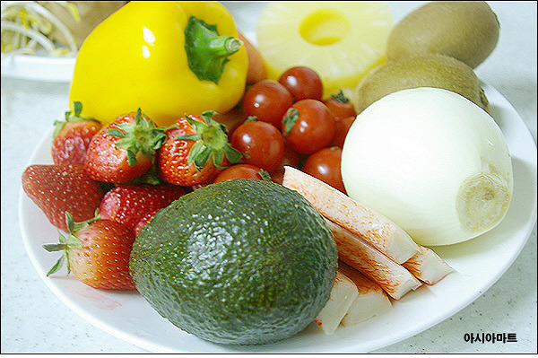 과일재료 : 아보카도, 사과, 키위, 감, 오렌지, 토마토, 파인애플통조림, 딸기, 바나나, 귤, 배,복숭아