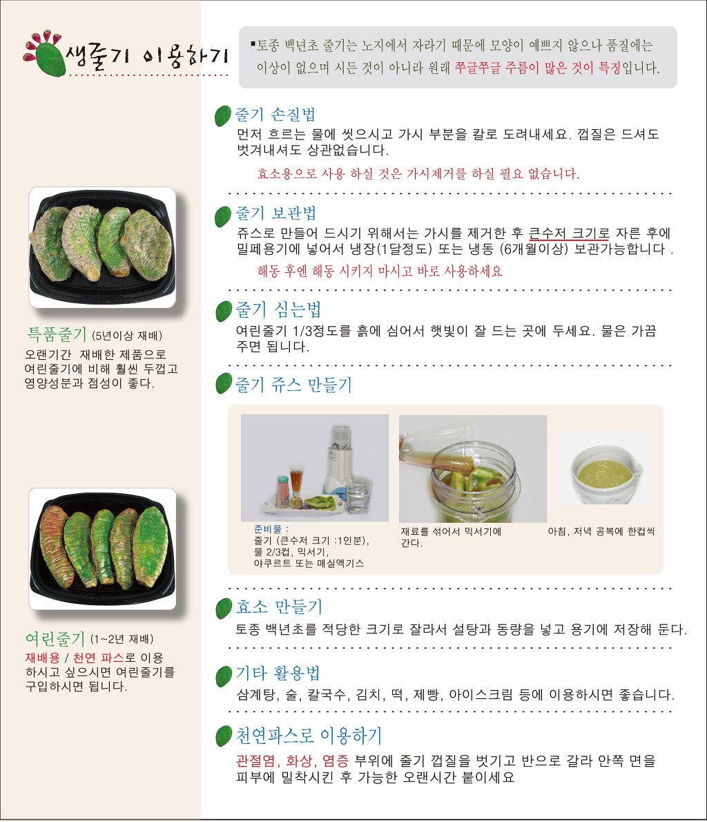*기관지, 천식, 갑상선, 위장, 장염, 냉증, 수종, 근종에 선인장 적당량을 꿀을 묻혀서 오랫동안 삶아 복용한다. *매일 한 두 차례 손바닥 1/2만큼 복용 |