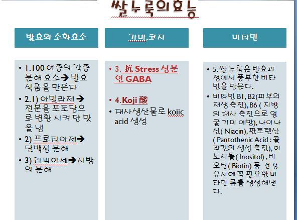 쌀누룩의 발효과정에서 생기는 소화효소에의해 육류와 생선을 숙성시켜 식감과맛을 좋게합니다,