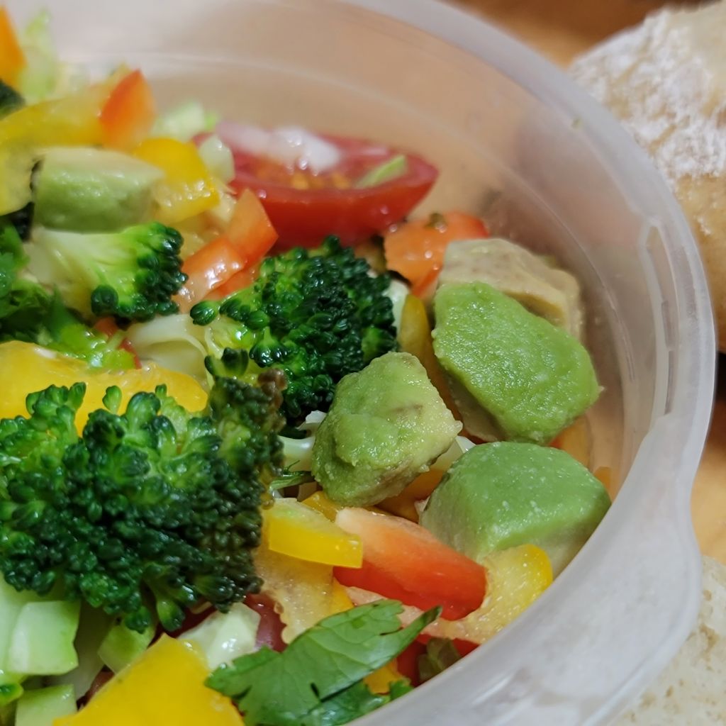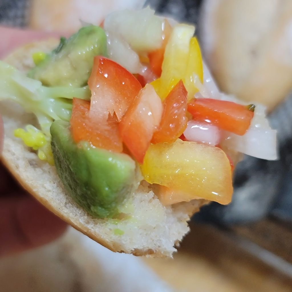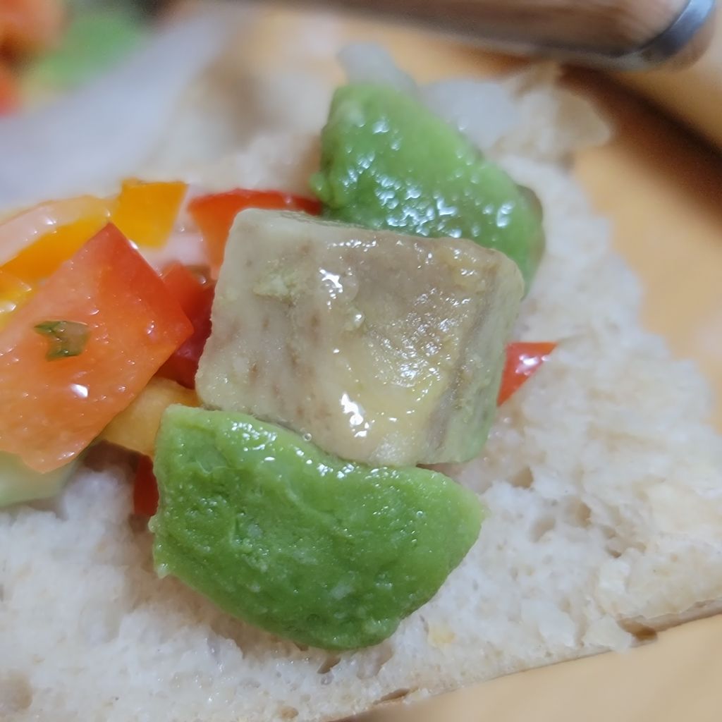 오이.양파.파프리카.브로콜리.아보카도.토마토 등의 야채에 식초와 올리브오일.소금 약간 넣어서 절여 놓은것인데 빵과 잘어울려요