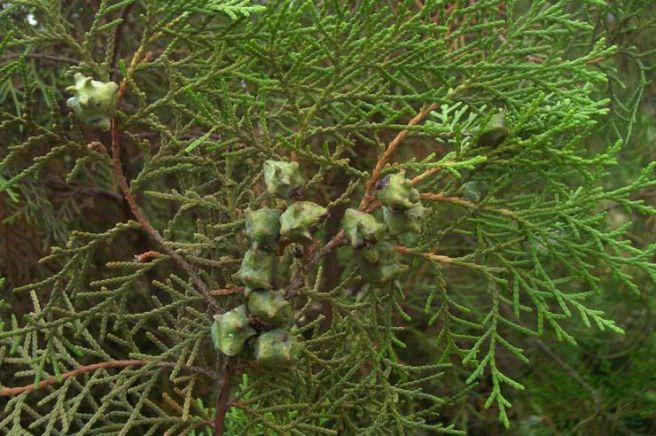 어릴 때는 바늘잎이지만 성장후에는 비늘 같이 부드럽게 되는 것도 있다. 꽃은 암수한그루이고 짧은 가지 끝이나