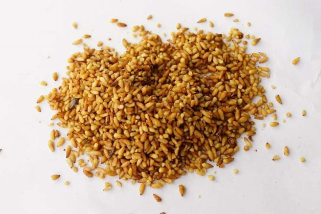 백자인(柏子仁)을 뜨거운 솥에 넣고 약한 불로 담황색이 되고 향기가 날 때까지 볶은 후 꺼내어 식힘.