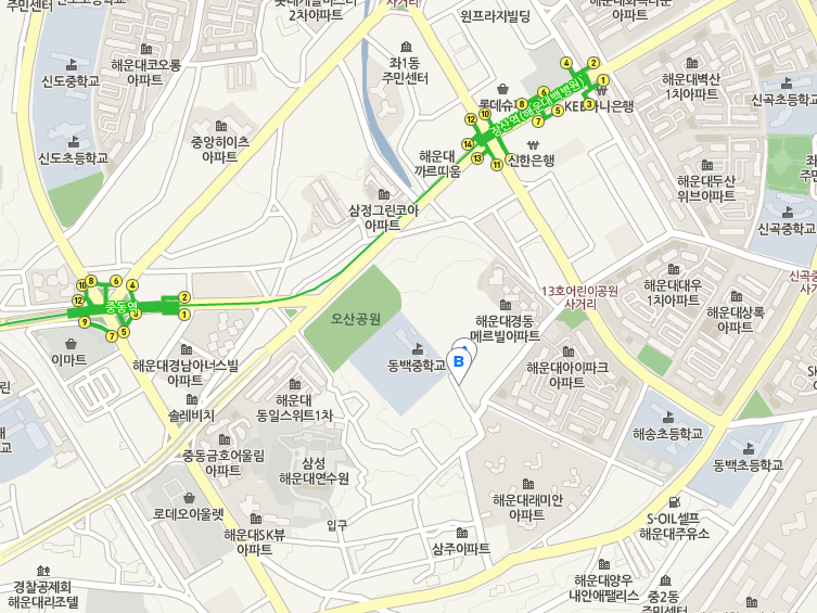 버스 - 39,100,200,141 등 해운대 보건소,동백초등학교, 현대아파트 하차 후 도보 7분
