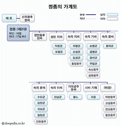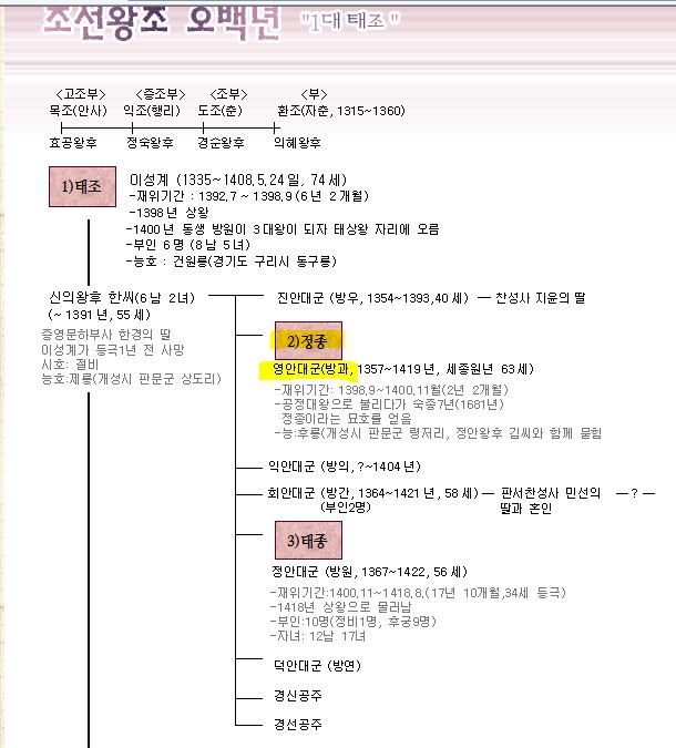 - 짧은 정치, 힘없는 임금 : 태조와 신의 왕후 한씨사이에서 2째 아들로 태어났다. (영안대군 방과) 태조의 장남인 방우가 병으로 세상을 떠났기 때문에 이성계는 방과를 세자로 책봉했던 것이다. 여하튼 조선 2대 임금으로 추대되었지만 이방원 등을 비롯한 개국공신들에 의하여 다스려지는 나라의 허수아비 임금에 불과하였다.