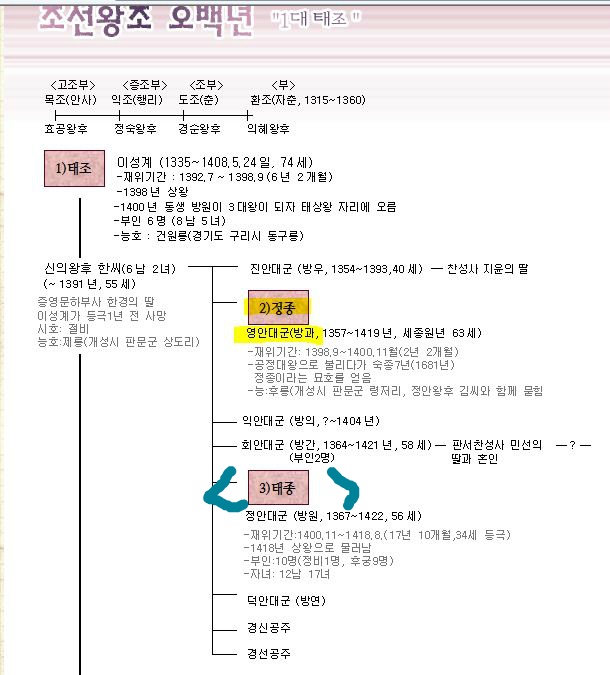태종 이방원 그는 이성계의 다섯번째 아들로 태어났다. 이방원의 가문은 무장 가문이었는데 유일하게 이방원이 문과급제를 한것이다. 이방원은 어릴적부터 이성계의 희망이였다. 이방원은 정몽주를 처치하는 거사가 성공한 뒤에 이성계를 추대하던 정도전,조준 등과 그의 부친을 왕으로 추대하였고, 공민왕의 왕비를 움직여 수창궁에서 즉위를 하게 하였다. 새로운 왕조를 만드는 중심에 항상 이방원은 그 중심에 있었다.