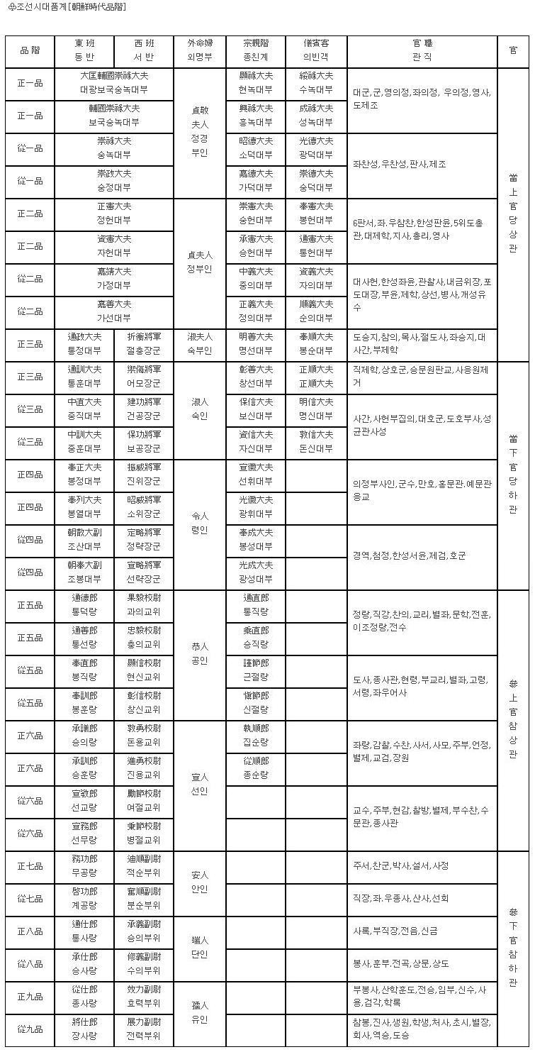 조선시대의 관료 조직은 문반과 무반의 양반 체제로 이루어졌고 상하 계급이 엄격하였다. 관료의 등급은 품(品) 또는 유품이라 하여 크게 9품이 있었다. 각 품에는 정(正)과 종(從)의 구별이 있어 정1품에서 종9품까지 18품으로 되어 있었다.