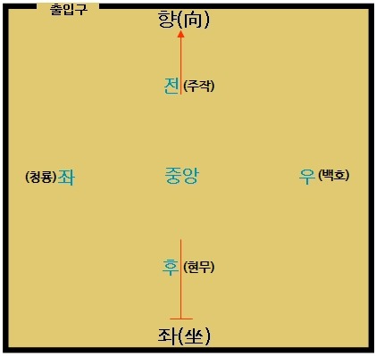 백호자리를 찾아내는 기준은 출입구 쪽을 기준으로, 향이 되는 것이므로 출입구를 바라보는 중앙에서 우측이 백호자리가 된다는 것을 기억하기 바란다.