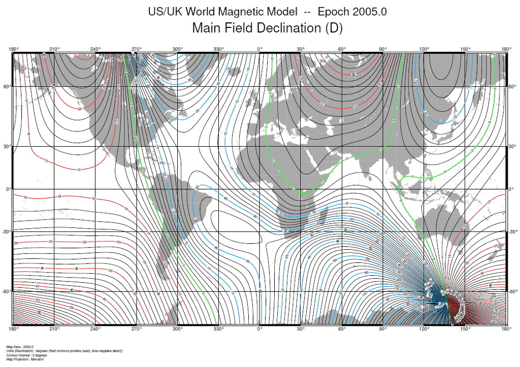 이 지도가 나타내는 것은 진북(실제 북극)과 자북 (나침반이 가리키는 북극)간의 차이값을 나타내고 있다. 즉 실제의 북극은 나침반에서 읽은 값에서 이 지도의 값을 보정해서 계산하면 어디인지를 알 수가 있도록 되어 있다.