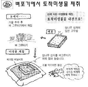 토착미생물은 자연농업을 하는데 있어 가장 널리 사용되는 기본적인 자재이다. 토양기반조성은 물론 섞어 띄움비 제조, 발효사료의 제조, 돈사나 계사의 바닭관리 등 안 쓰이는 곳이 없다. 토착미생을 논밭에 사용할 때는 위에 뿌려 주면된다. 땅은 위에서부터 만들어지고 대부분의 미생물이 표토 5cm 내외에서 살고있으면로 위에 뿌려주어야 한다. 토착미생물을 이용해 당근 효소토를 만들어 상토로 활용하면 건강한 묘를 기를수 있는데, 미처 당근 효소토를 못만들었을 겨우 상토위에 토착미생물을 뿌려주어도 좋은 효과를 볼 수 있다. 또 토착미생물 원종을 활용해 농업용 약수를 만들어 작물이나 양돈이나 양계에 사용하면 작물과 가축이 건강하게 자란다. 토착미생물을 활용할 때 천혜녹즙, 유산균 등과 함께 활용하면 미생물의 활동을 강화시켜 더 뛰어난 효과를 거둘 수 있다. 썩어 띄움비 | 농업에 있어 쌀겨는 참으로 그 용도가 다양하다. 한마디로 쌀겨는 값싸고 강력한 힘을 가지고 있는 비료(肥料)의 근원이자 미생물의 활력을 북돋아주는 근원이다. 논이나 밭에 쌀겨를 뿌리면 쌀이나 야채의 맛이 월등히 좋아지며 품질도 우수해진다. 또한 미생물들의 좋은 먹이가 되며, 발효를 촉진시키는 기폭제 역활을 한다. 섞어띄움비에 쌀겨를 적당량 넣으면 미생물의 원기가 한결 왕성해지며, 논의 표토충에 뿌려주면 표토가 몽글몽글하게 변해 제초효과도 발휘하게 되며, 밭의 경우 포실포실하게 돼 물빠짐이 좋아지는 등 토양이 개선된다. 값싸고 저력을 가지고 있는 쌀겨는 토착미생물과 함께 할 때, 생산비를 낮추고 양과 질을 함께 끌어 올리는 농가의 강력한 자원인 것이다.
