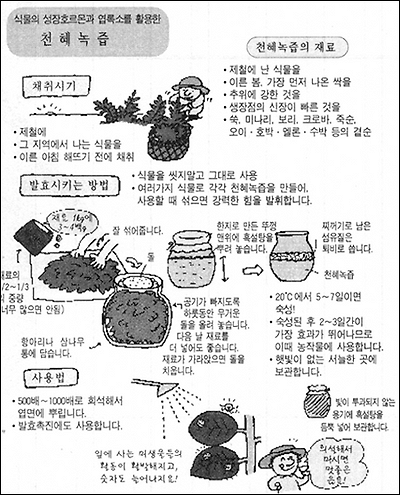 | | ■ 6 ■ [천혜녹즙의 활용] | | 천혜녹즙은 토착미생물과 함께 가장 널리 쓰이는 기본자재이다. 토양기반조성은 물론 종자첨종, 건전생육, 당도제고에 이르기까지 폭넓게 사용한다. 토양기반 조성의 경우 토착미생물과 함께 천혜녹즙을 활용하면 미생물의 활동을강화시켜 토앙기반을 더욱 촉진시킴과 아울러 소화흡수력이 강한 뿌리의 형성을도와준다. 천혜녹즙은 종자가 지닌 본래의 힘을 발휘토록 하는데 활용된다. 오늘날 종자는 예전과 달리 화학 제품적으로 생산되고 있다. 따라서 소독약에 찌들어 있을뿐만 아니라 허약해 본래 가지고 있던 종자의 힘을 충분히 발휘하지 못한다. 어느종자든 씨젖이라는 사적(史的)양분을 지니고 있다. 이 양분은 생활력이 강하고 환경적응력이 뛰어나다. 천혜녹즙은 종자가 지닌 생명력을 강화시켜준다. 한방영양제, 미네랄 등과 함께 종자를 처리하면 종자에 힘을 불어넣어 본래의 생명력을 발휘할 수 있도록 해준다. 마찬가지로 작물의 발육과정에 천혜녹즙을 사용하면 작물체에 영양과 휠력을 불어넣어 건강한 체질을 만들어준다. 다만 영양분의 선택은 작물체에 맡겨야 한다. 사람이 인위적으로, 획일적인 영양분을 공급할 경우 흡수가 낮을 뿐 아니라 영양분 공급의 불균형으로 작물이 건강하게 자랄수 없다. 천혜녹즙은 소재가 다양하고 계절별로 채취해 사용할 수 있으므로 작물의 생장단계별로 알맞은 소재를 선택해 사용할 수 있다. 영양생장기(營養生長期)에 채취한 소재는 영양생장기에 생식생장기(生植生長期)에 채취한 소재는 생식생장기에 사용하는 것이 좋다. 천혜녹즙은 숙성후 2~3일 이내가 가장 힘이 강력하므로 가능한 이 때 사용하는 것이 좋다. 천혜녹즙의 사용할 때 기본적인 희석배수는 5백배이며, 욕심을내 진하게 사용하면 농도장애가 올 수 있으므로 주의해야 한다. 다만 유인살충주에 활용할 때는 회석배수를 엷게 하는 것이 좋고 제초용 목적으로 활용할때는 원액으로 사용한다. 천혜녹즙을 만들고 난 찌꺼기는 버리지 말고 재탕하거나 닭똥, 톱밥등과 재발효시켜 활용하면 좋다. ◇ 토양기반 조성: 천혜녹즙 5백배액을 미네랄A 1천배액, 토착미생물과 함께 살포 ◇ 작물의 서리피해 예방: 물 1백l 에 천혜녹즙 5 백배액을 현미식초 5백배액, 소주 반홉을 함께 섞어 해뜨기 전에 흠뻑 살포 ◇ 사과 응애 퇴치 : 토착미생물로 기반조성을 하고 천혜녹즙 5백배 희석액을 현미식초 5백배 희석액과 인산칼슘 1천배 회석액을 엽면시비 ◇ 토마토의 당도증가 : 아카시아 천혜녹즙5백배 희석액을 현미식초, 제 1인산칼숨, 바닷물 0.1%액과함께 엽면시비 ◇ 송아지 설사 치료: 천혜녹즙 5백배 희석액을 미네랄A액 5백배희석액, 한방영양제 5백배 희석액, 현미식초 3백배 희석액과함께 먹인다 ◇ 돈사바닥관리: 천혜녹즙5백배 희석액을소주, 유산균과함께 바닥에 관주한다.