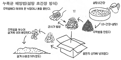 ① 김치를 담궜던 항아리에 쌀겨 15kg을 넣고 여기에 천혜녹즙 5백배 희석액을 3l 정도 넣어 섞는다. ② 또 다른 항아리에는 천혜녹즙을 넣고 청국장, 토착미생물, 유산균액을 만든다. ③ ①의 쌀겨에 ②의 미생물액을 뿌리고 다시 잘 섞는다. 이 때 수분윤 70%로 조절한다. ④ 여름철이라면 가마니 볏짚, 거적을 덮어 발효를 도와주고, 겨울철에는 초기발효를 잘 이끌어가기 위해 뜨거운 물을 넣은 패트병 2개를 쌀겨 가운데 묻어 놓고 가마니나 거적을 덮어 보온을해준다. ⑤ 5시간이나 반나절 정도 지나가면 발효와 벌열이 시작되며, 발효가 시작되면 아침 저녁으로 뒤집어준다. 이때 항아리가 두개 있다면 번갈아 전부를 옮겨 놓는 것으로 작업은끝나는것이며, 초기에 온도는 60~70??까지 이른다. ⑥ 이러한 과정을 반복하여 7~10일간 계속하게 되면 쌀겨섞어띄움비의 온도는 점차 안정되며 40?? 정도로 떨어진다. 이렇게 해서 완성되면 새콤달콤한 냄새가 나게 된다. 1백평당(10a 하우스 토지 동일) 쌀겨섞어띄움 15kg와 쌀겨 40kg를 1년에 3회정도 뿌려주는 것으로 토양은 풍부해진다. | |