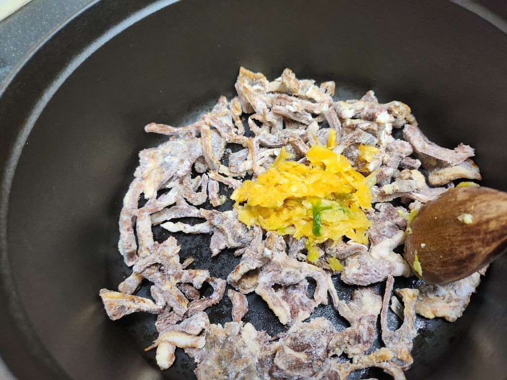 냄비에 고기.다진마늘 넣고 볶다가