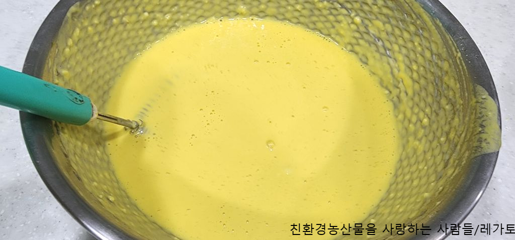 밀가루에 계란, 소금 넣어 치자물로 반죽했어요.
