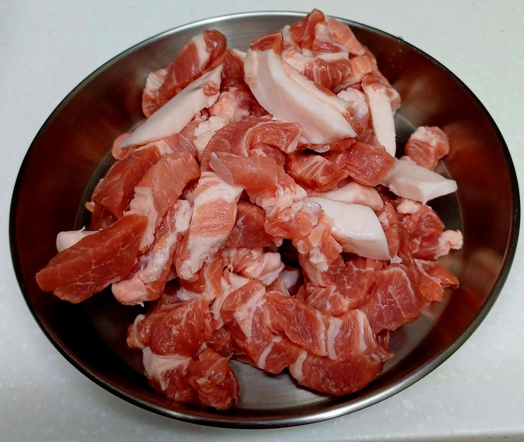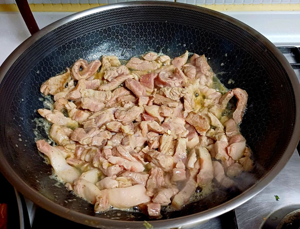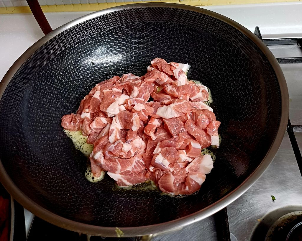 돼지목살 한근 잘게 썰어 들기름에 생강가루 한꼬집 김치국물 한국자 설탕 한스푼 넣어서 볶습니다