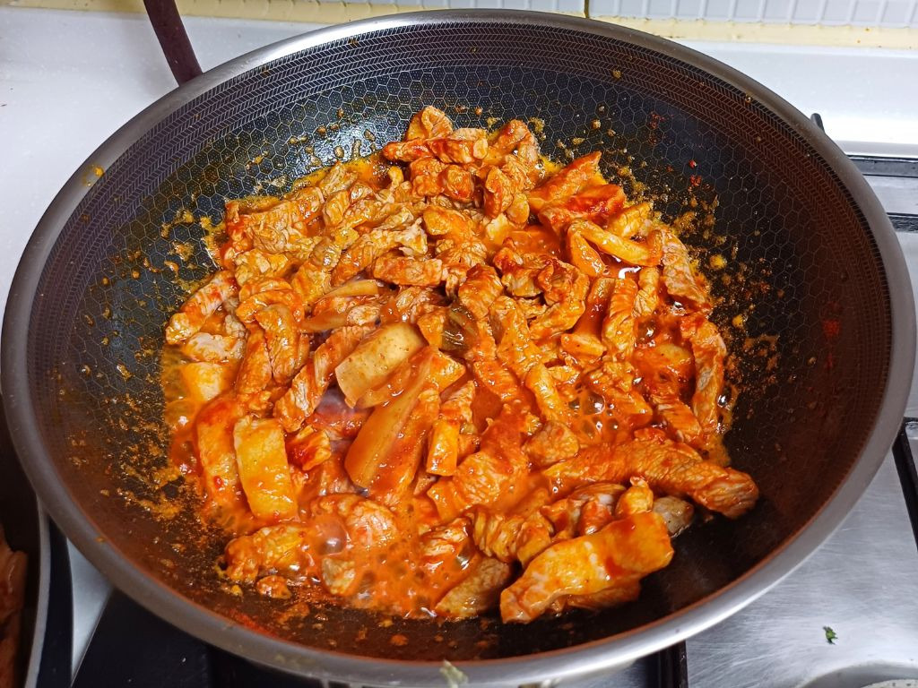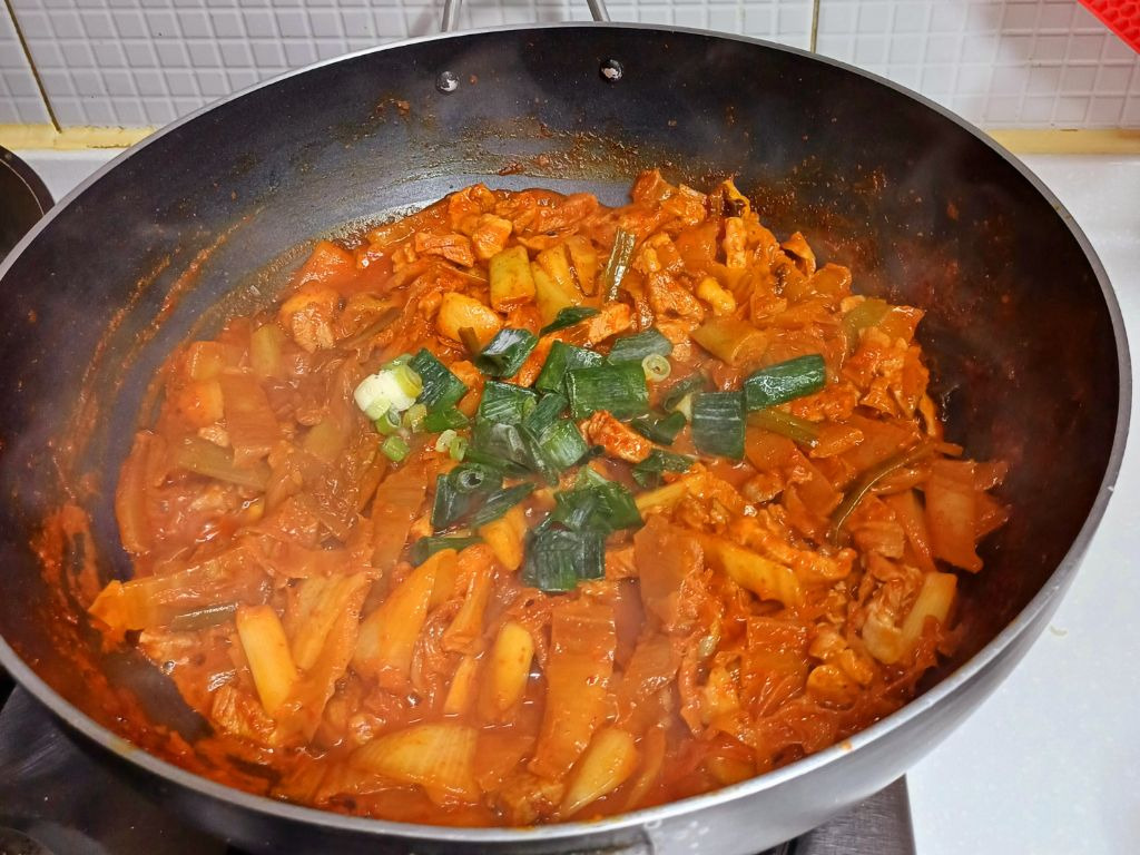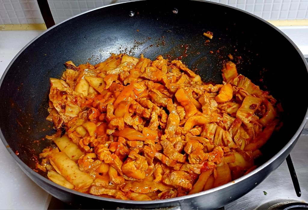 반쯤 김치가 익으면 볶은 고기도 넣고 같이 볶아요