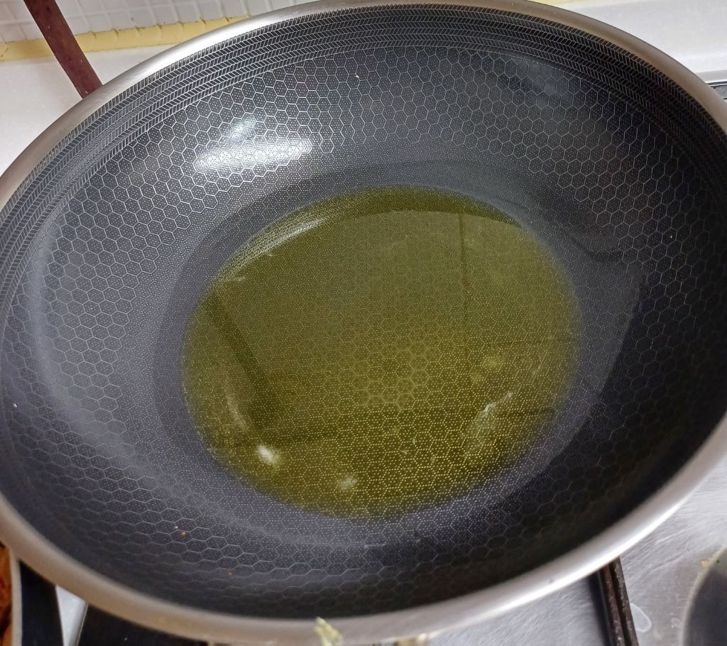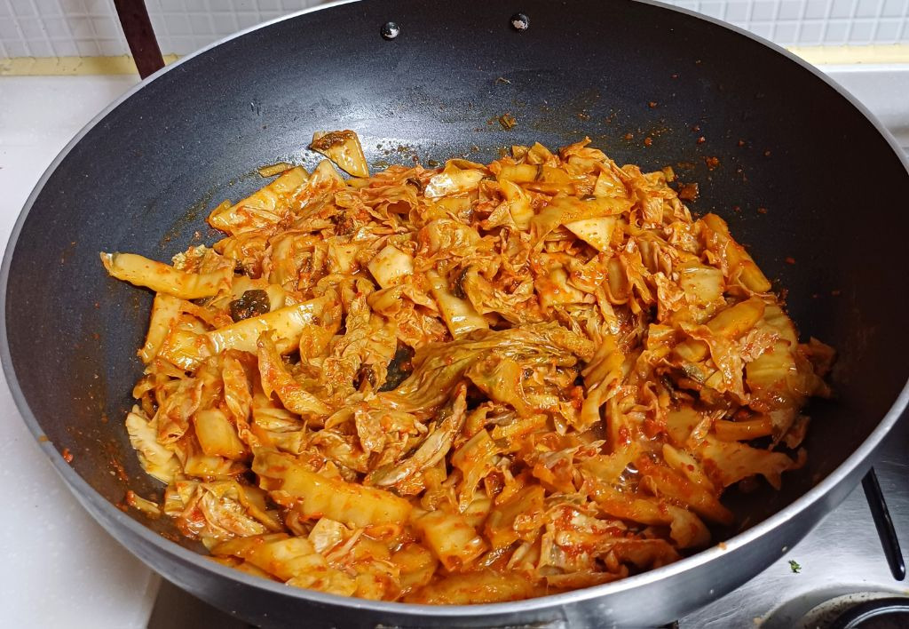 묵은지 한포기 꺼내 국물을 짜서 들기름에 볶아줍니다