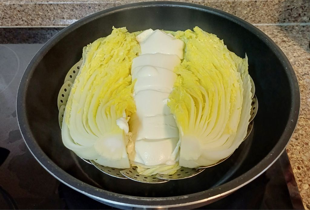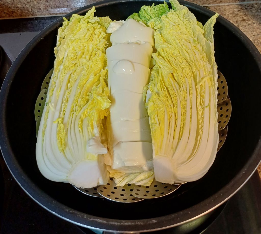 찜기에 배추랑 순두부 올려서 쪄줍니다
