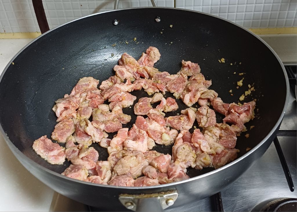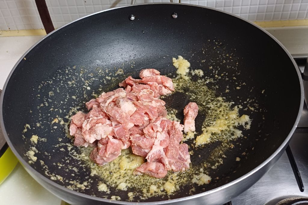 밑간 한 고기를 넣습니다
