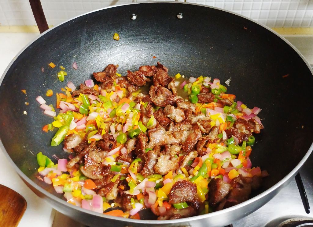 볶아둔 고기를 따로 담아도 되지만 저는 섞어서 한번 볶아줍니다