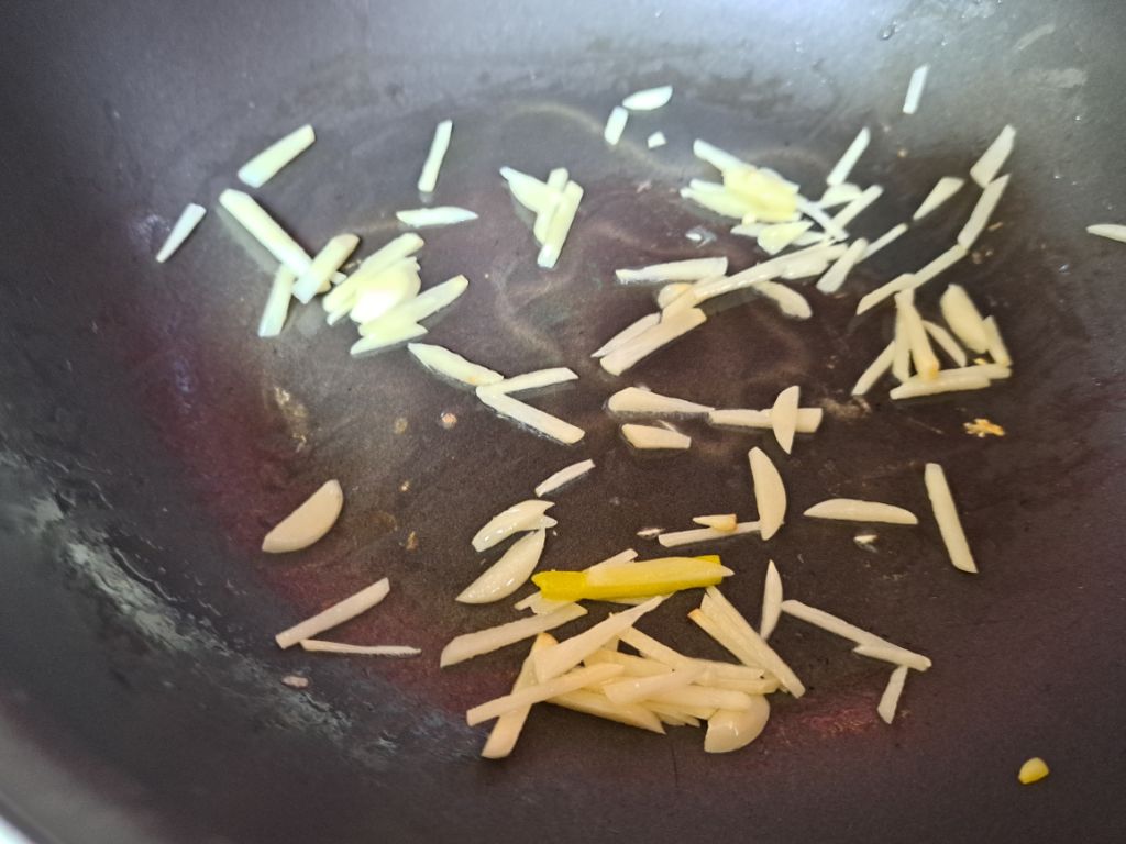 채썬 마늘부터 팬에 넣고 볶습니다.