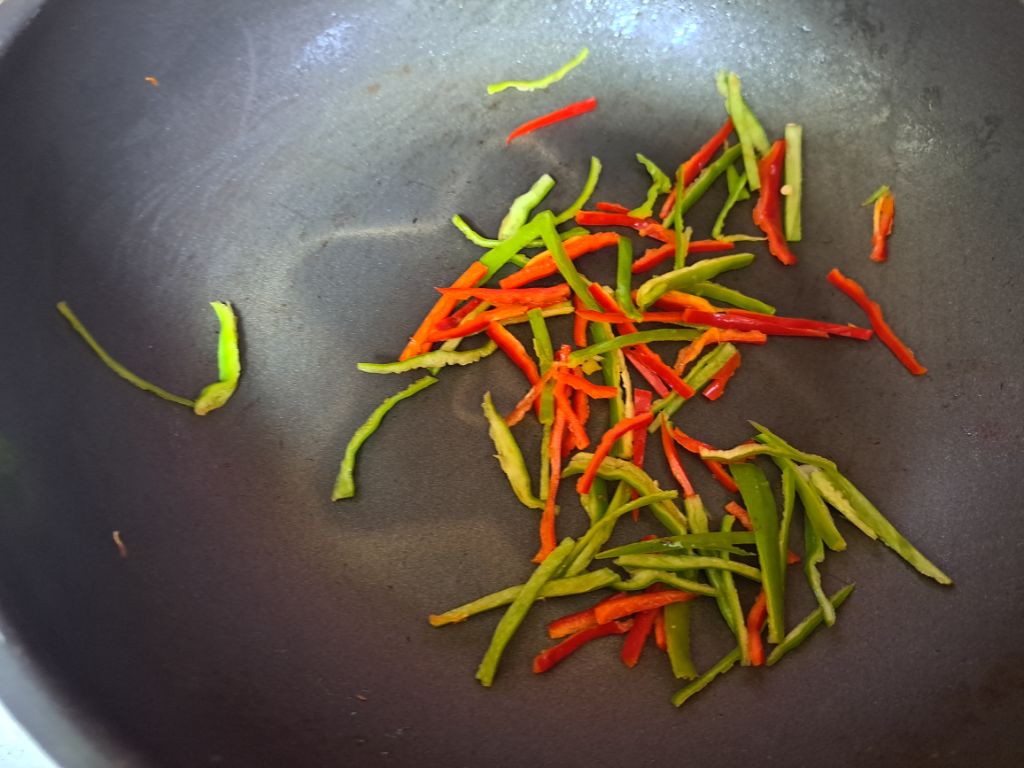 청양고추와 홍고추도 잔열에 볶아줍니다.