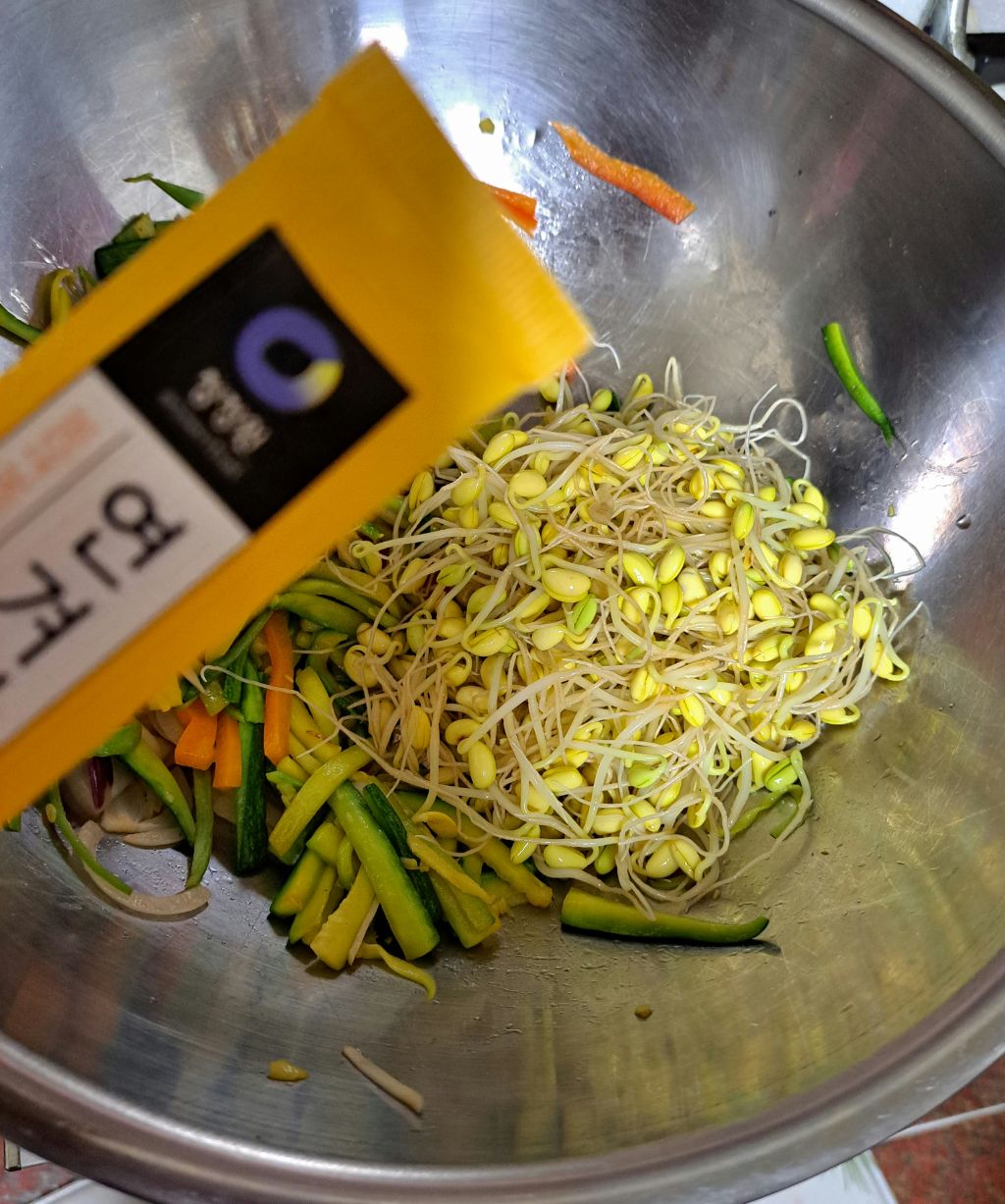 콩나물담고 소금과 연겨자. 참기름.후추가루.깨만넣고