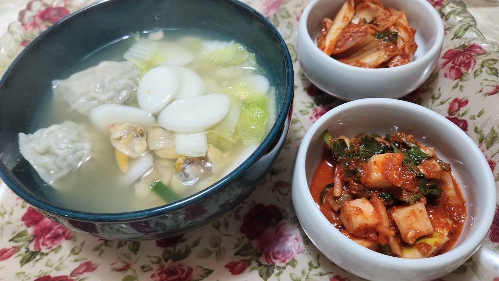볼에 떡국을 담고 맛있게 익은 깍두기와 겉절이를 곁들였습니다.