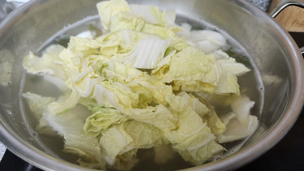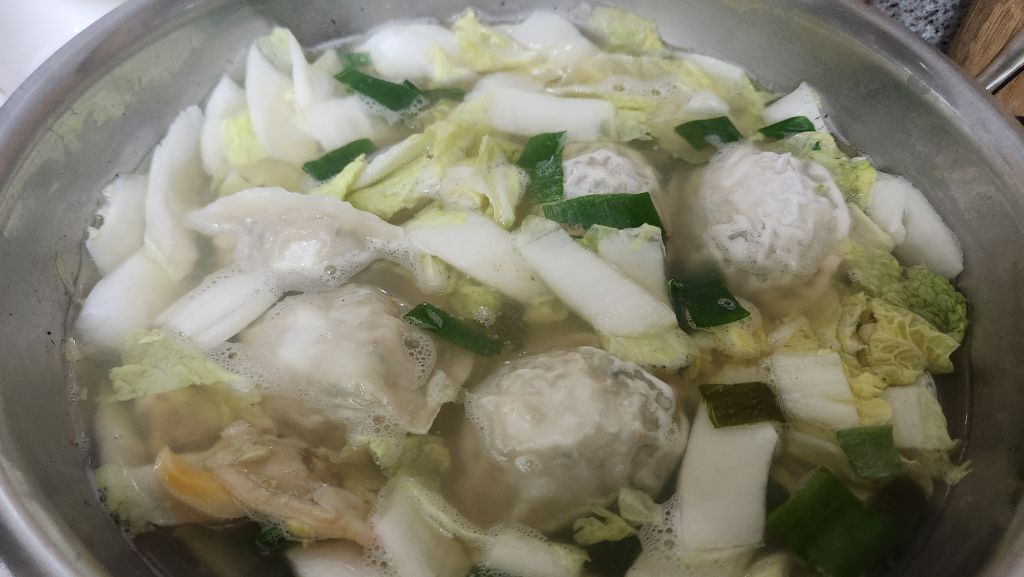 냉동실에 있던 만두를 넣고 뚜껑덮어 끓이다가