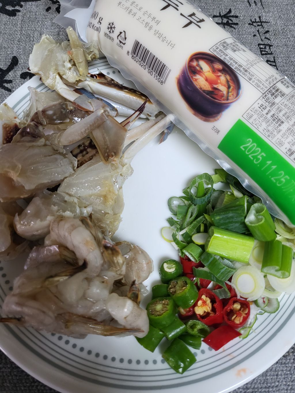 꽃게.새우살.순두부.파.마늘.청.홍고추 준비
