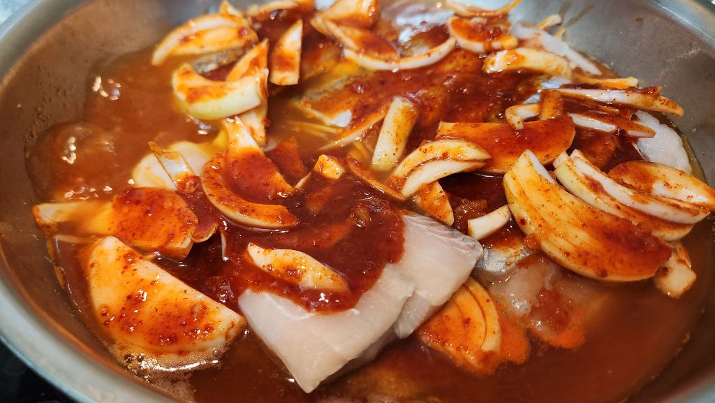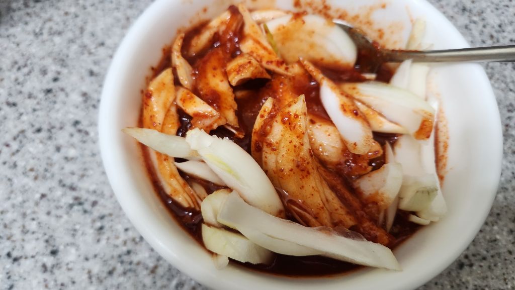 썰어둔 양파를 넣어 양념장을 만듭니다.