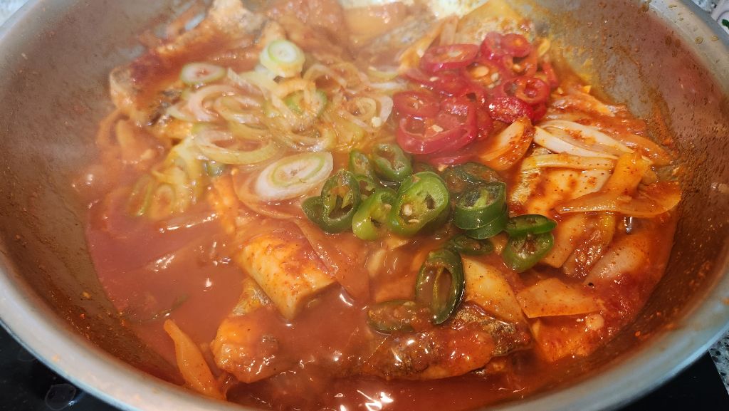 청홍고추와 대파를 어슷 썰어 올리고 한소큼 더 끓입니다.