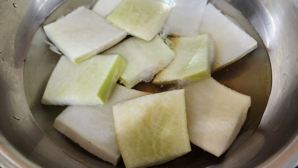 물에 어간장을 살짝 넣어 큼직하게 썬 무를 넣고 익힙니다.