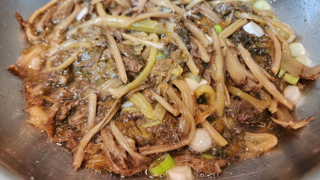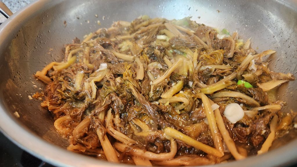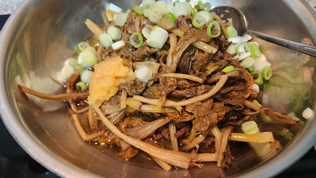 일부를 냄비에 담고 파, 마늘, 들기름 어간장을 넣고 조물조물 무쳐요.