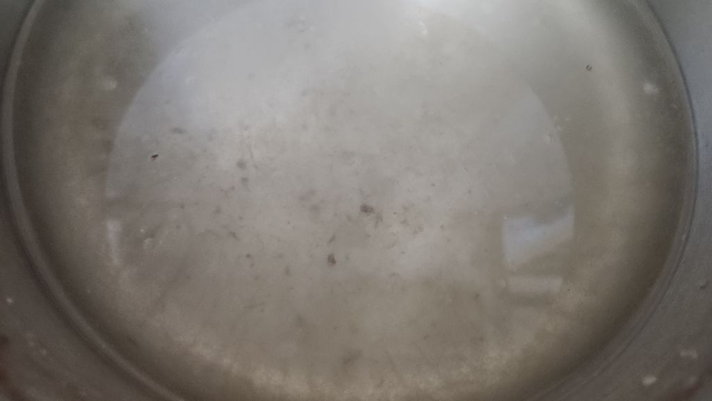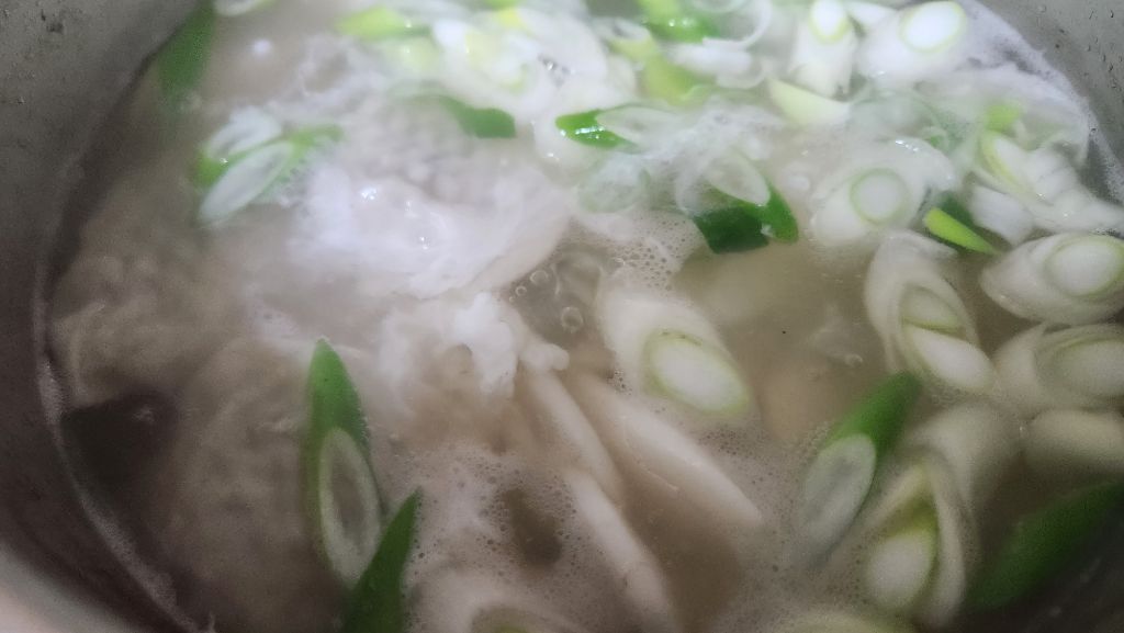 차게 식혀 기름을 걷어낸 육수를 끓여요.