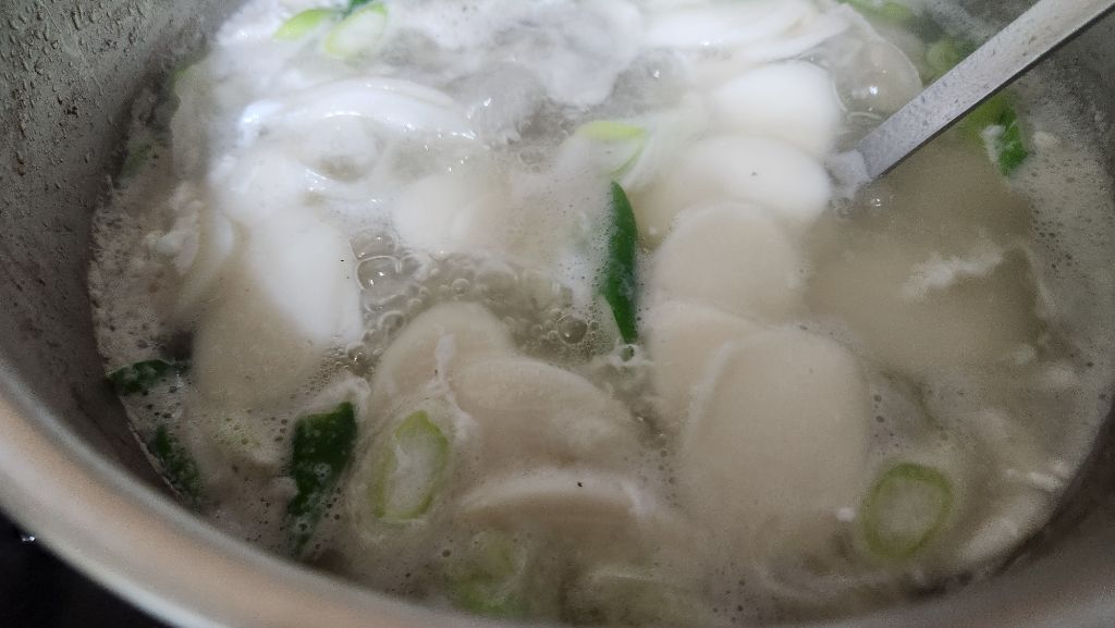 떡이 떠오르면 소금으로 간을 맞추고 불을 꺼요.