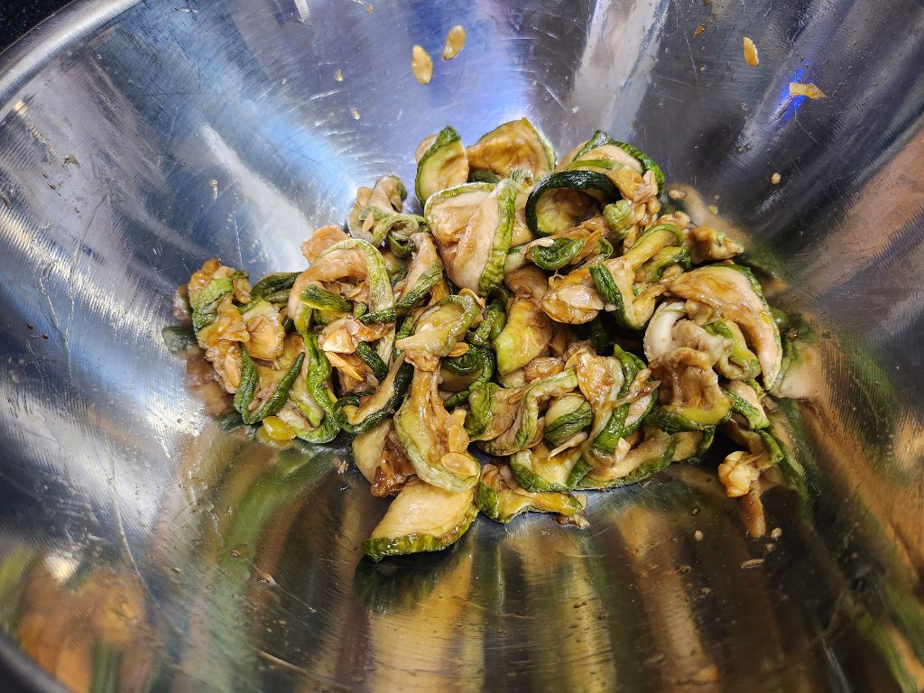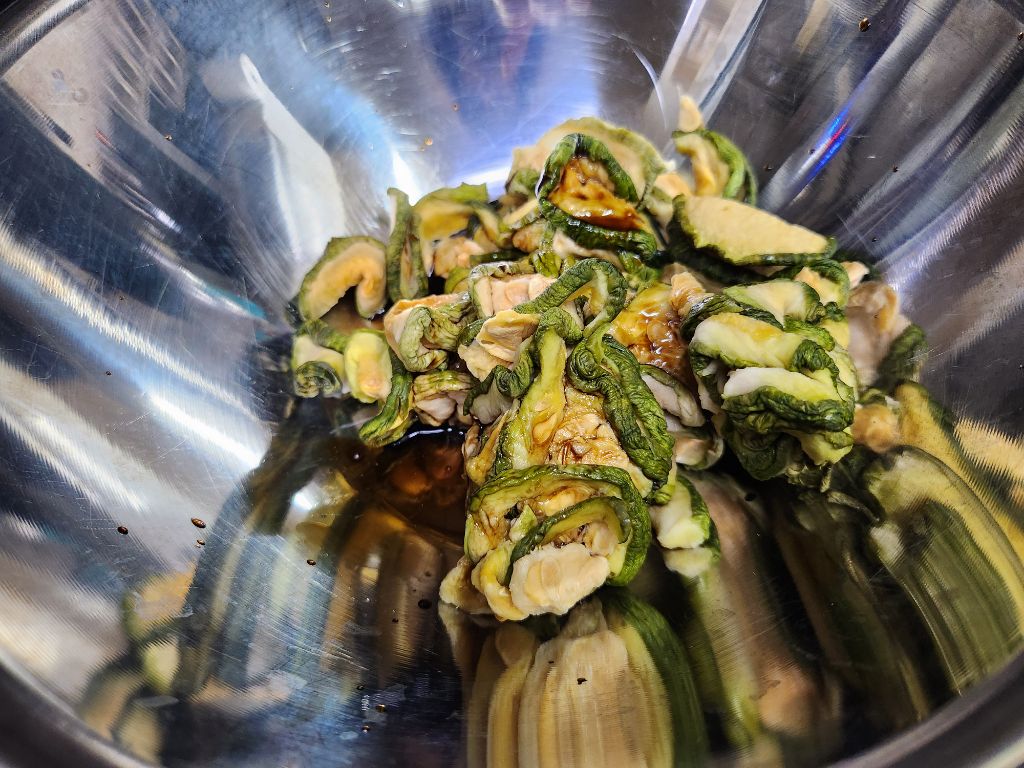 건호박을 불려서 깨끗이 씻어 꼭 짜서 준비하고, 국간장, 들기름, 다진 마늘을 넣고 조물조물 무쳐 놓습니다.