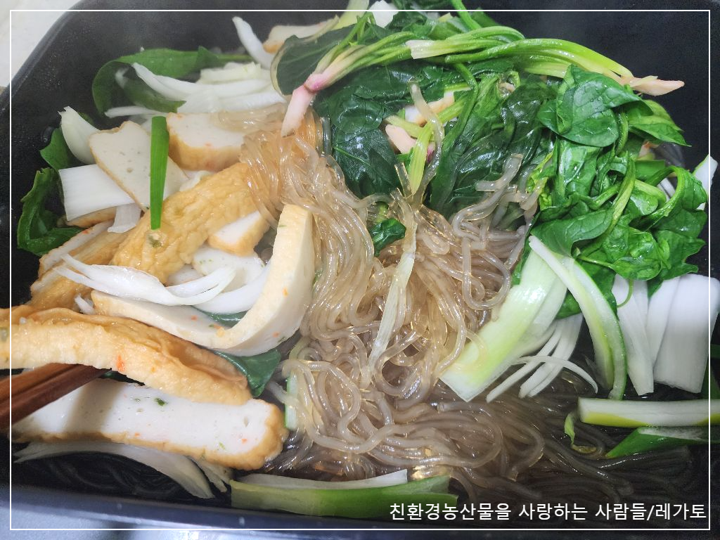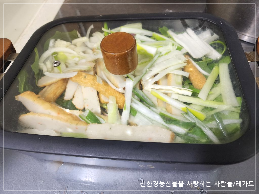준비한 어묵, 대파, 양파 모두 올려 뚜껑을 덮어 익혀요.