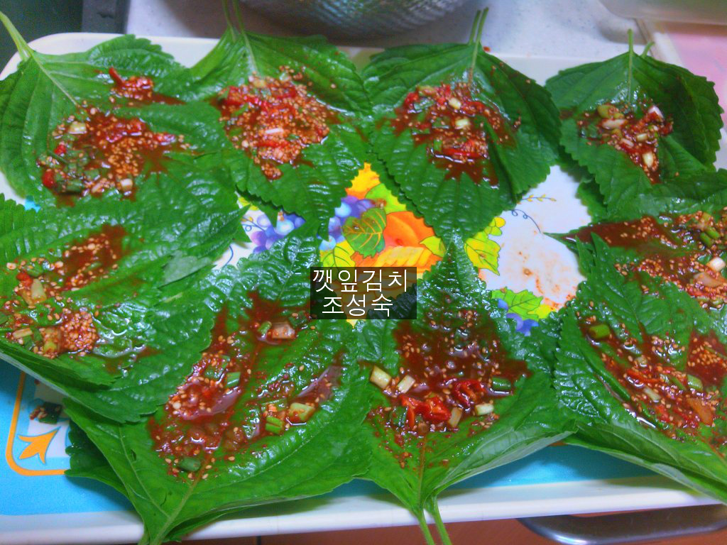 깨끗히 잘씻은 들깨잎을 물기를 뺀후 쟁반에 두장씩둘러놓고 (넘많아서 한장씩 하기힘들어서요 )