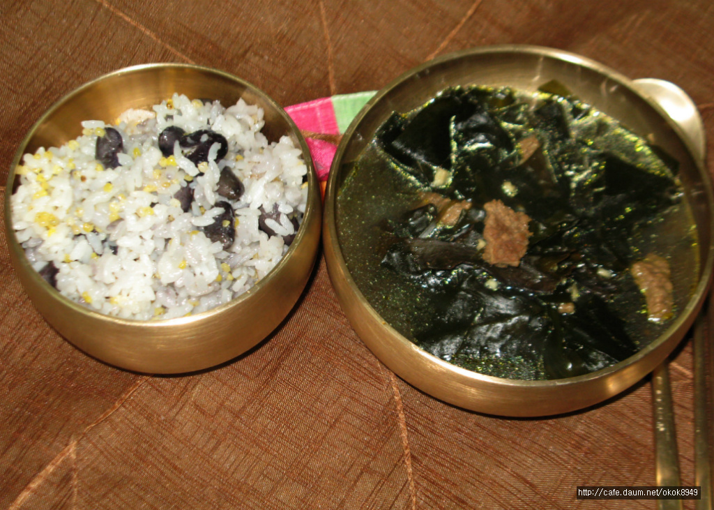 좁쌀과 콩을넣고 밥을 지어서 미역국과 함께 담아주었어욤