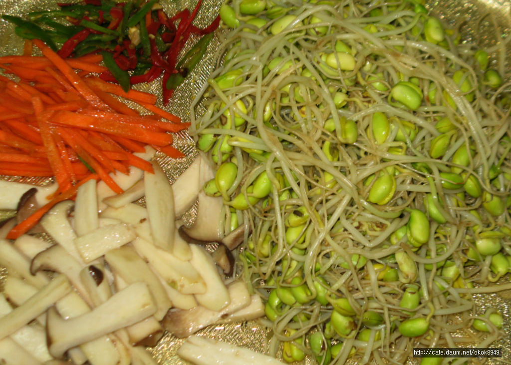 마침 냉장고에 새송이 버섯이 있기에 당근.새송이버섯.청양고추.콩나물을 각각 삶고 볶았답니다.