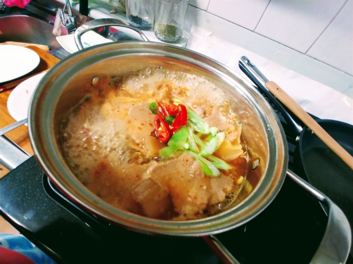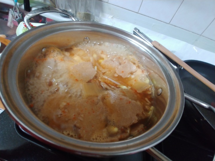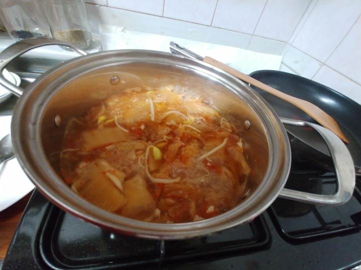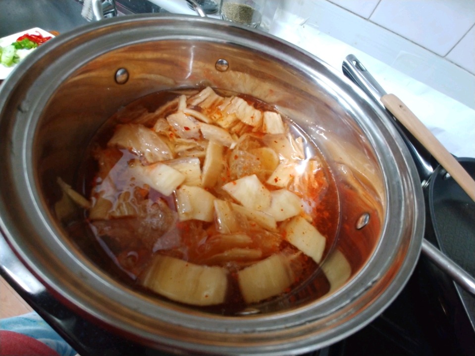 미리 만든 육수에 묵은지와 고춧가루, 마늘을 넣고 끓여줍니다.