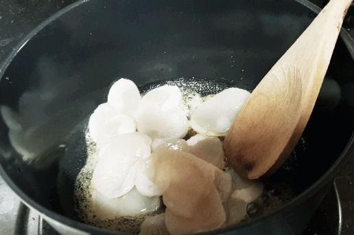 냄비에 참기름을 두르고 관자부터 넣고 볶아 줍니다