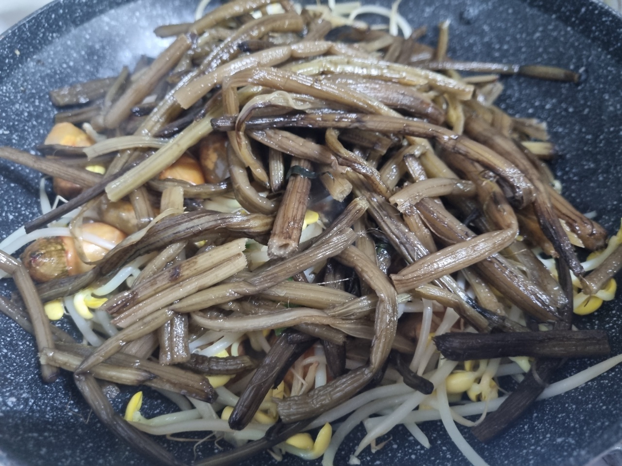 흐르는물에 콩나물 미더덕 머윗대 세척하고