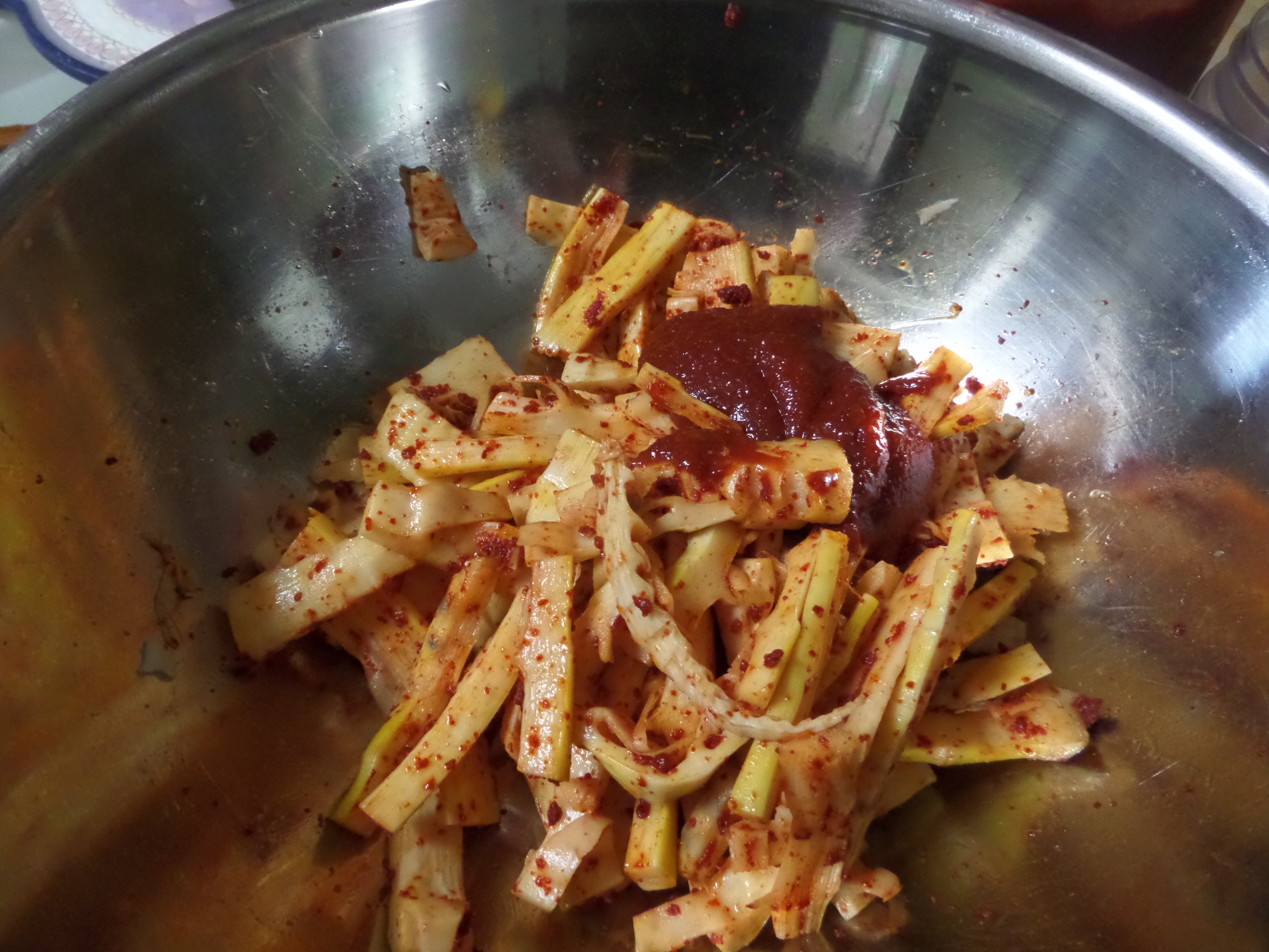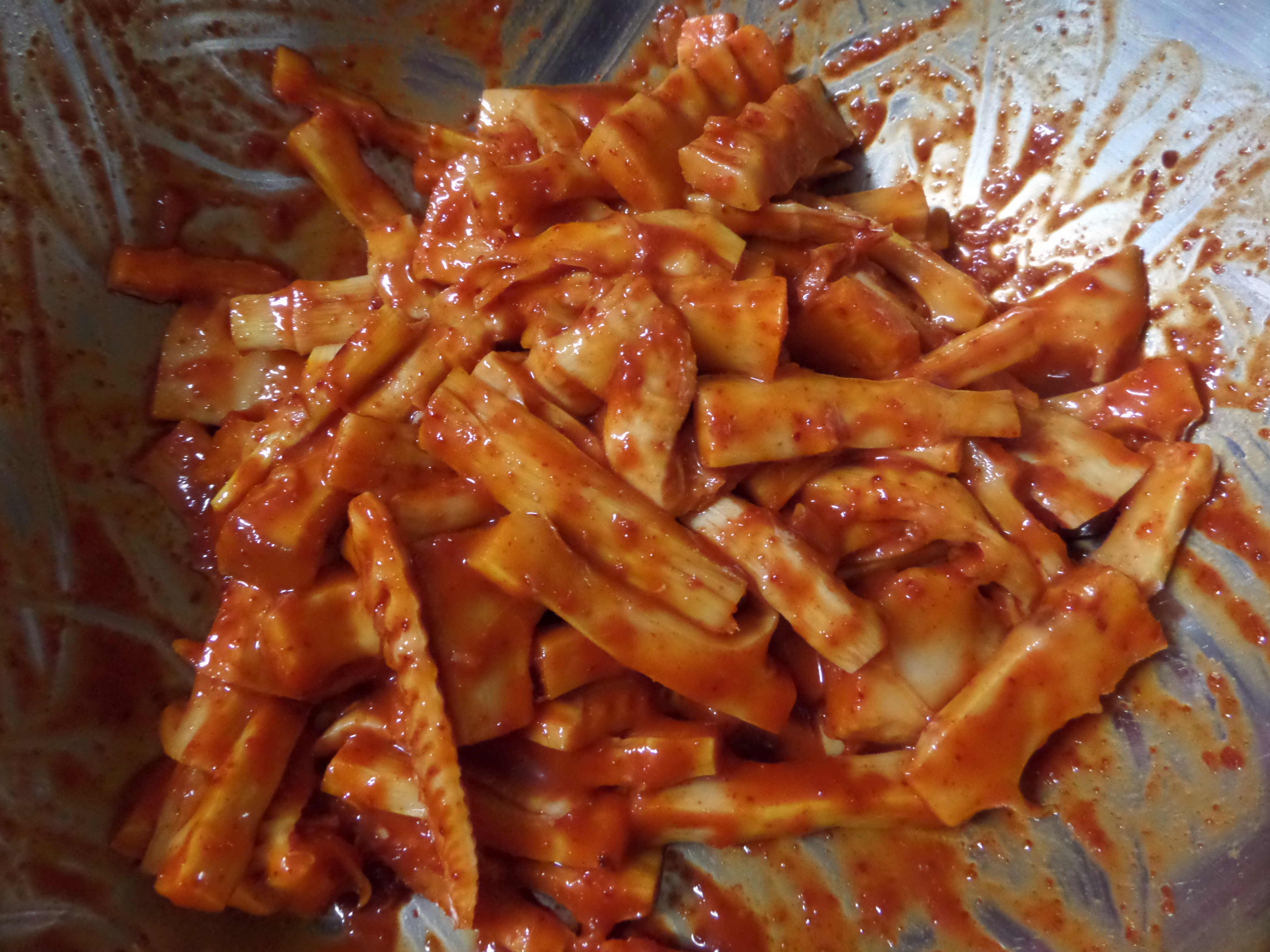 죽순에 고운 고춧가루 넣고 한번 버무린 후에 고추장 넣고 무칩니다.