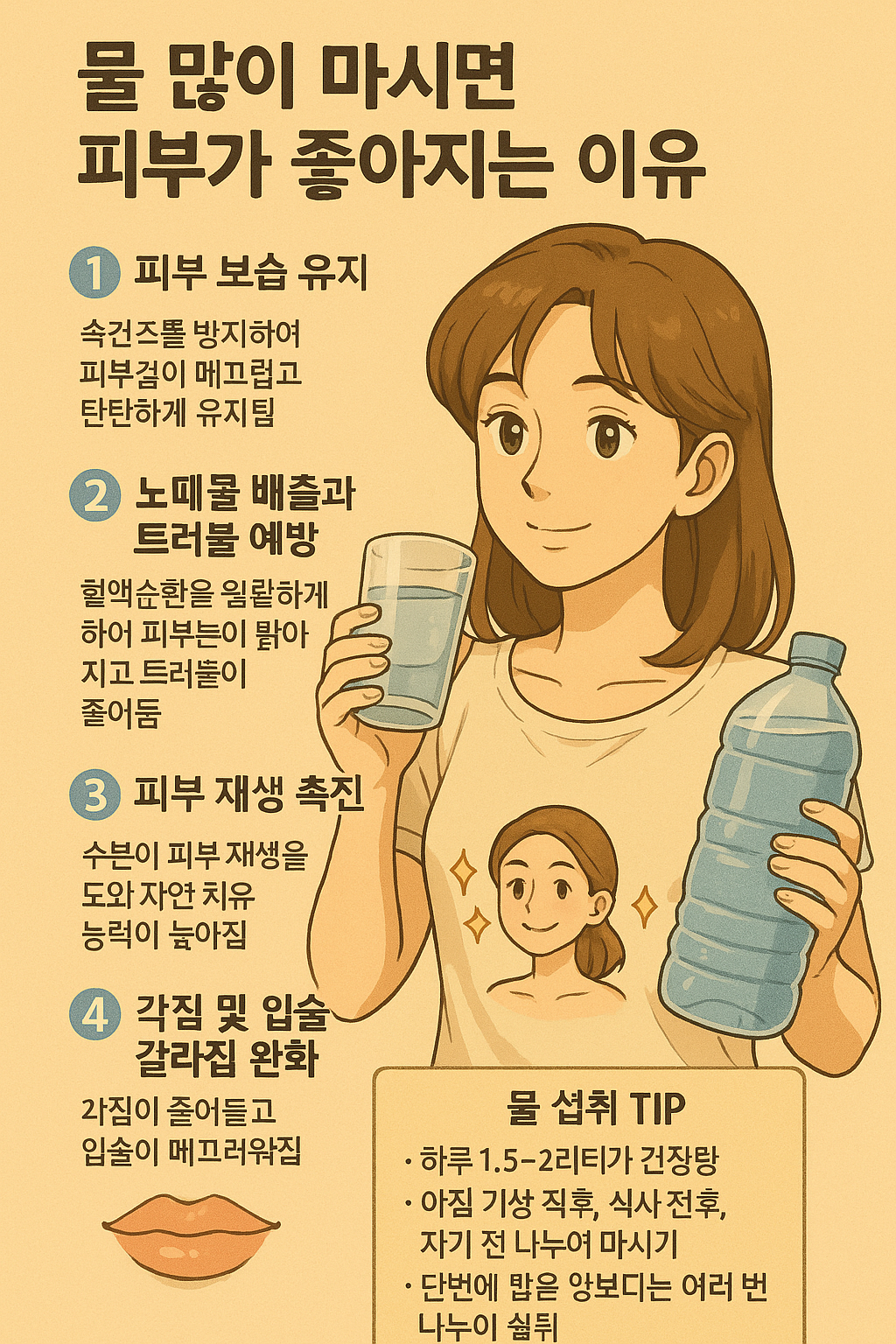 수분은 혈액순환을 원활하게 하고, 체내 노폐물과 독소를 배출하는 데 도움을 줍니다. 그 결과 피부 트러블이 줄어들고, 피부톤이 맑아지는 효과를 기대할 수 있습니다.
